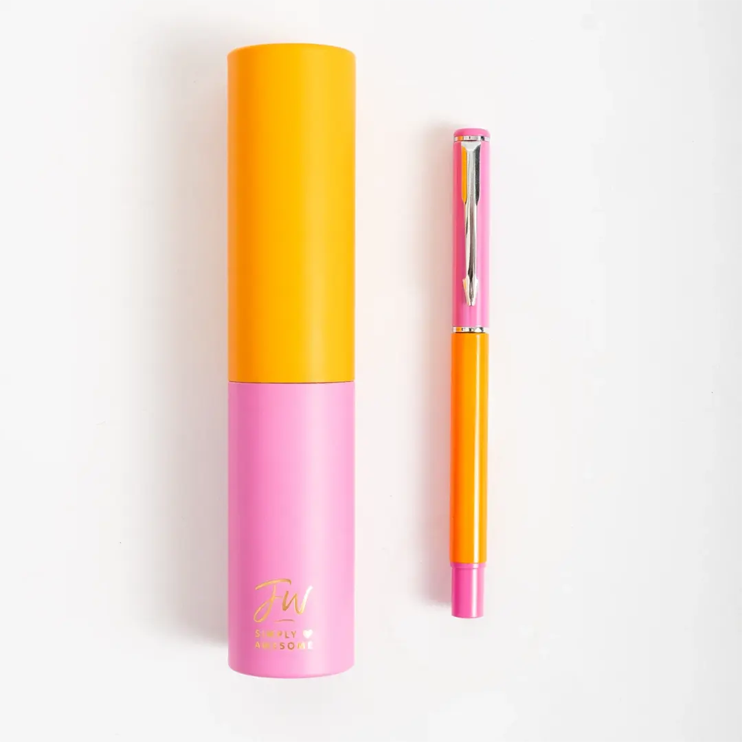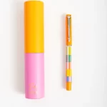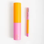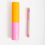 Bolígrafo Colorblock con tapa y tinta azul. Incluye estuche en forma de tubo, ideal para regalar o llevar a todos lados.