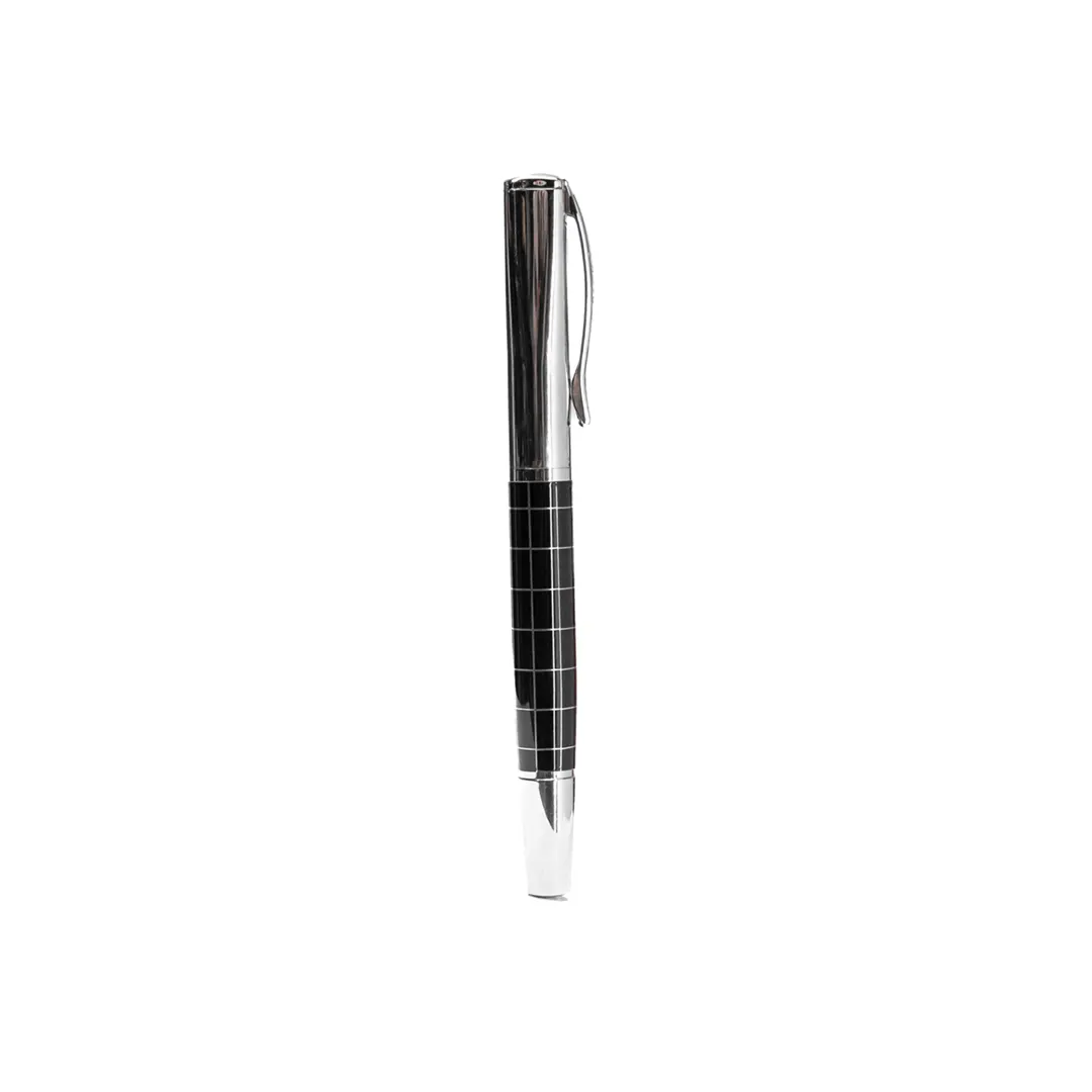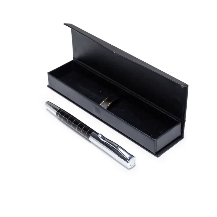Bolígrafo con tapa , tinta azul y cuerpo metálico. Cada unidad viene en un estuche de cartón rígido con logo en hot stamping.