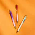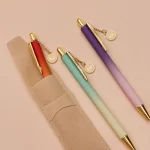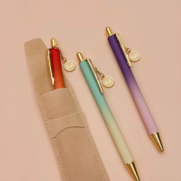 Bolígrafo retráctil con tinta azul, acabado mate soft touch y charms dorados. Incluye funda de velvet para un toque elegante y sofisticado.