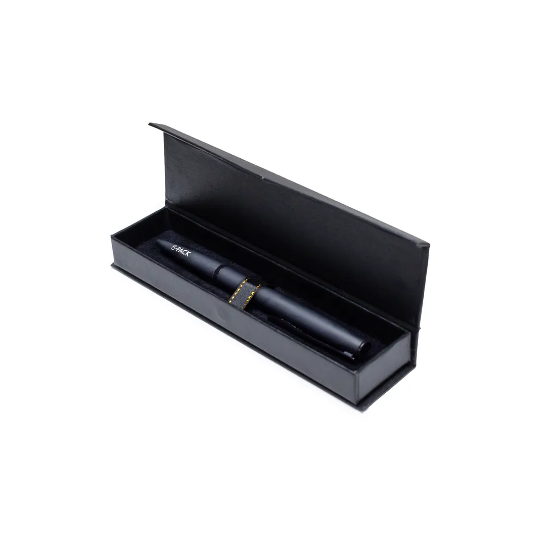 Bolígrafo retráctil con tinta azul y cuerpo metálico. Cada unidad viene en un estuche de cartón rígido con logo en hot stamping.
