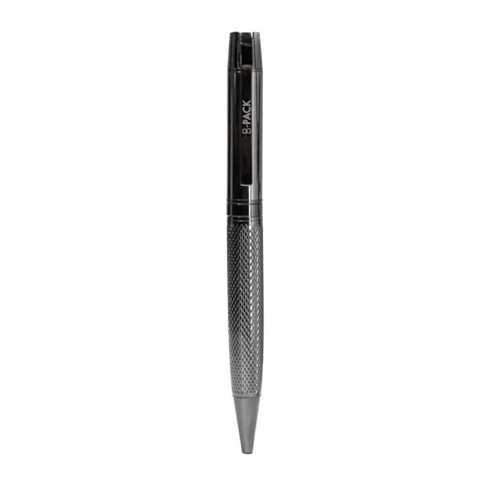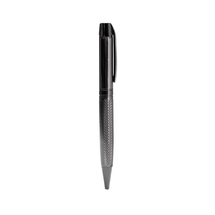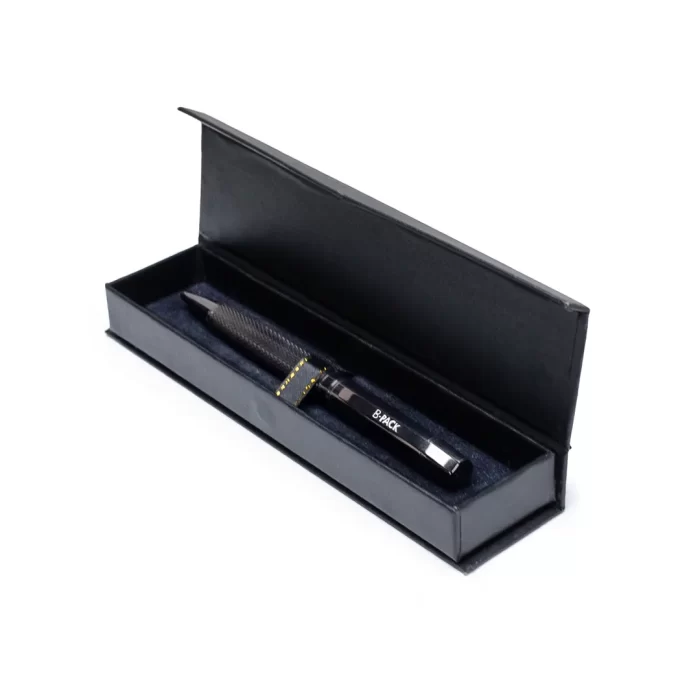 Bolígrafo retráctil con tinta azul y cuerpo metálico. Cada unidad viene en un estuche de cartón rígido con logo en hot stamping.