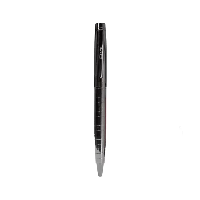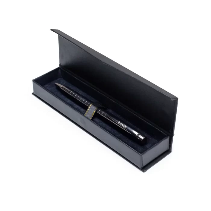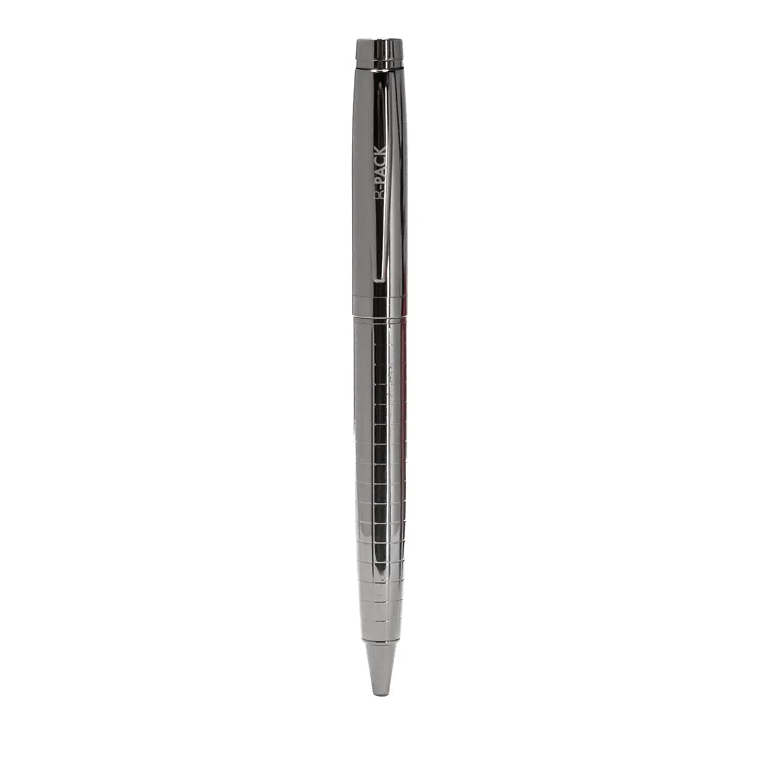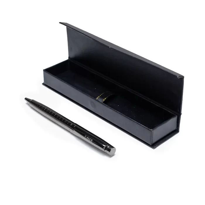 Bolígrafo retráctil con tinta azul y cuerpo metálico. Cada unidad viene en un estuche de cartón rígido con logo en hot stamping.