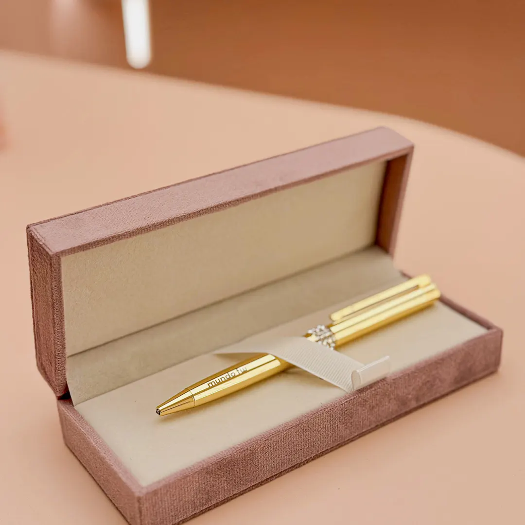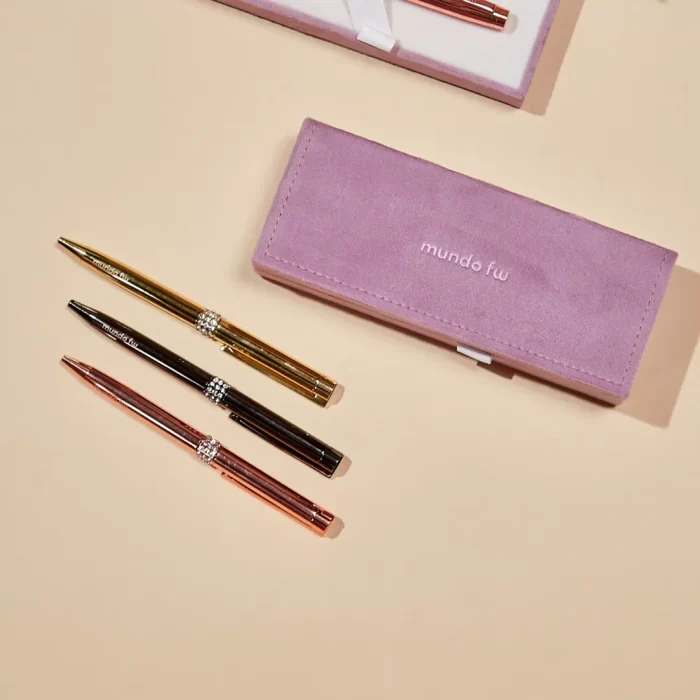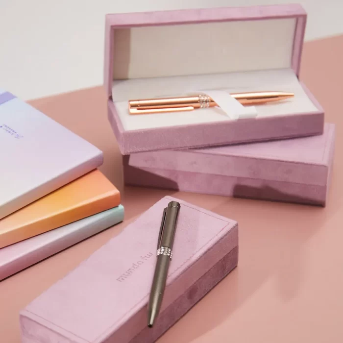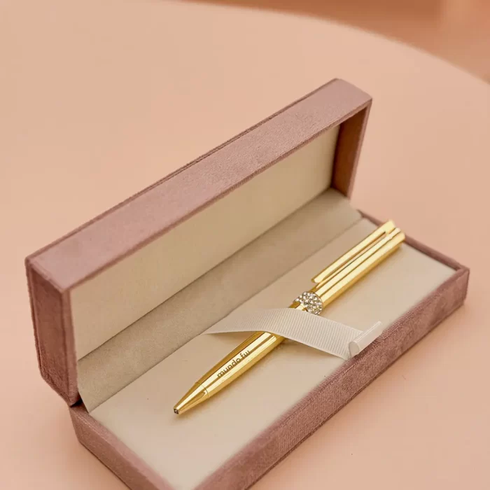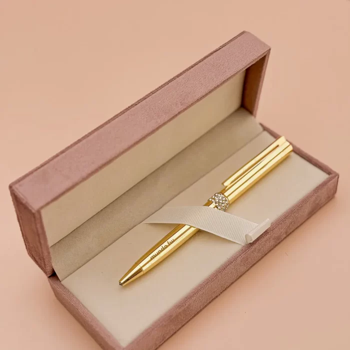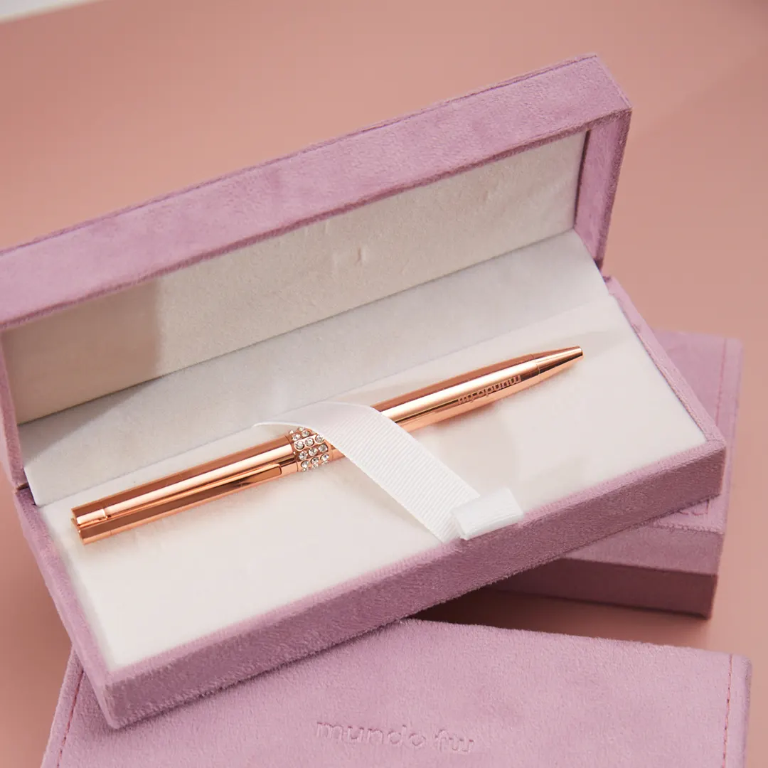 Bolígrafo retráctil con tinta azul con acabado de brillo y detalles en strass . Incluye un estuche rigido velvet para un toque elegante y sofisticado.