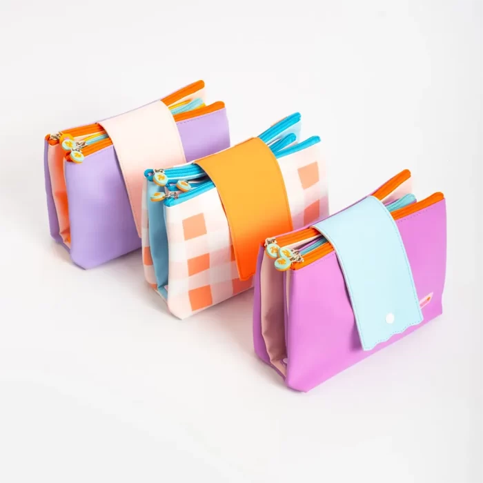 Organizador cartuchera de 20 x 15 x 7.5 cm, con un compartimento desmontable transformandolo en 2 organizadores. Fabricado en PU soft y con interior desmontable para mayor practicidad. Variantes de color: cuadrille naranja, fascia y violeta.