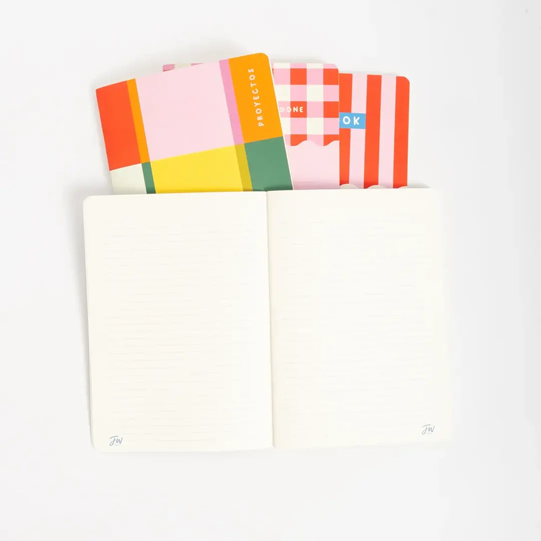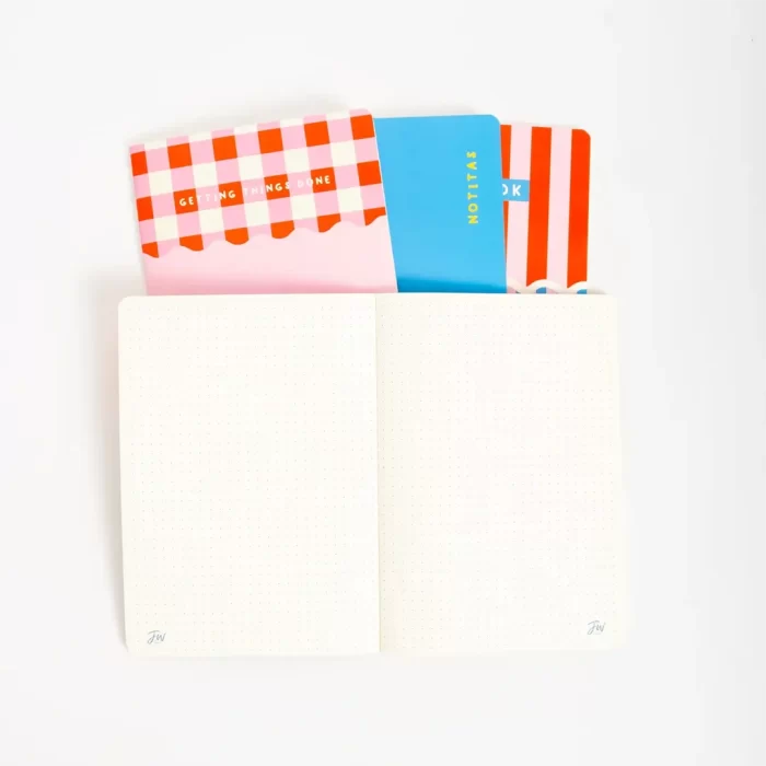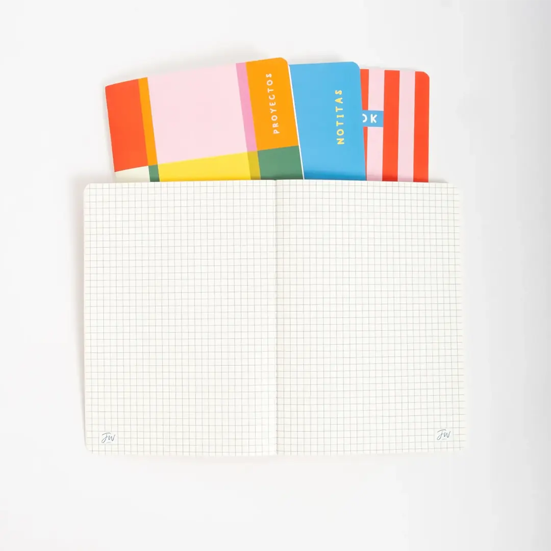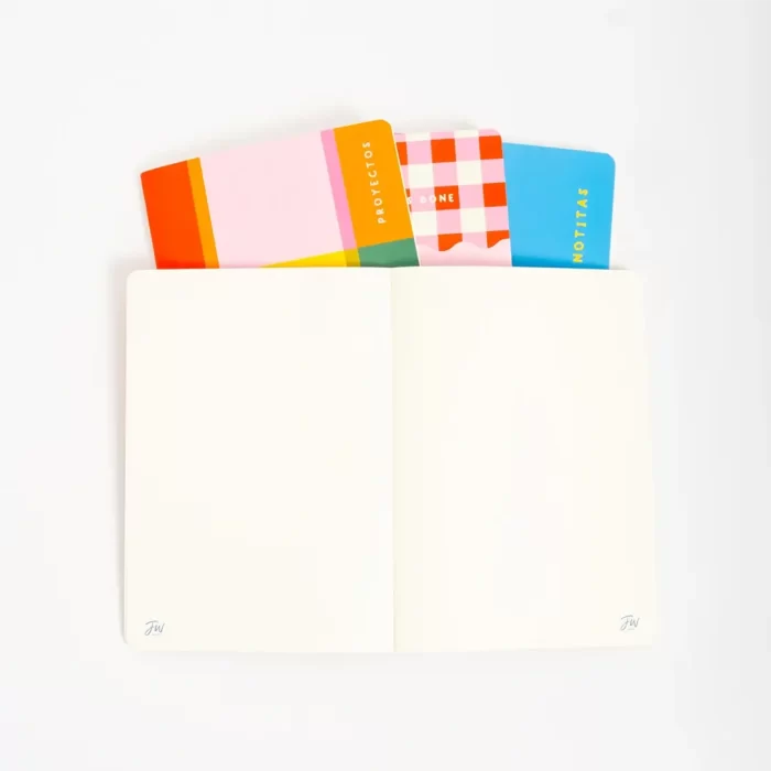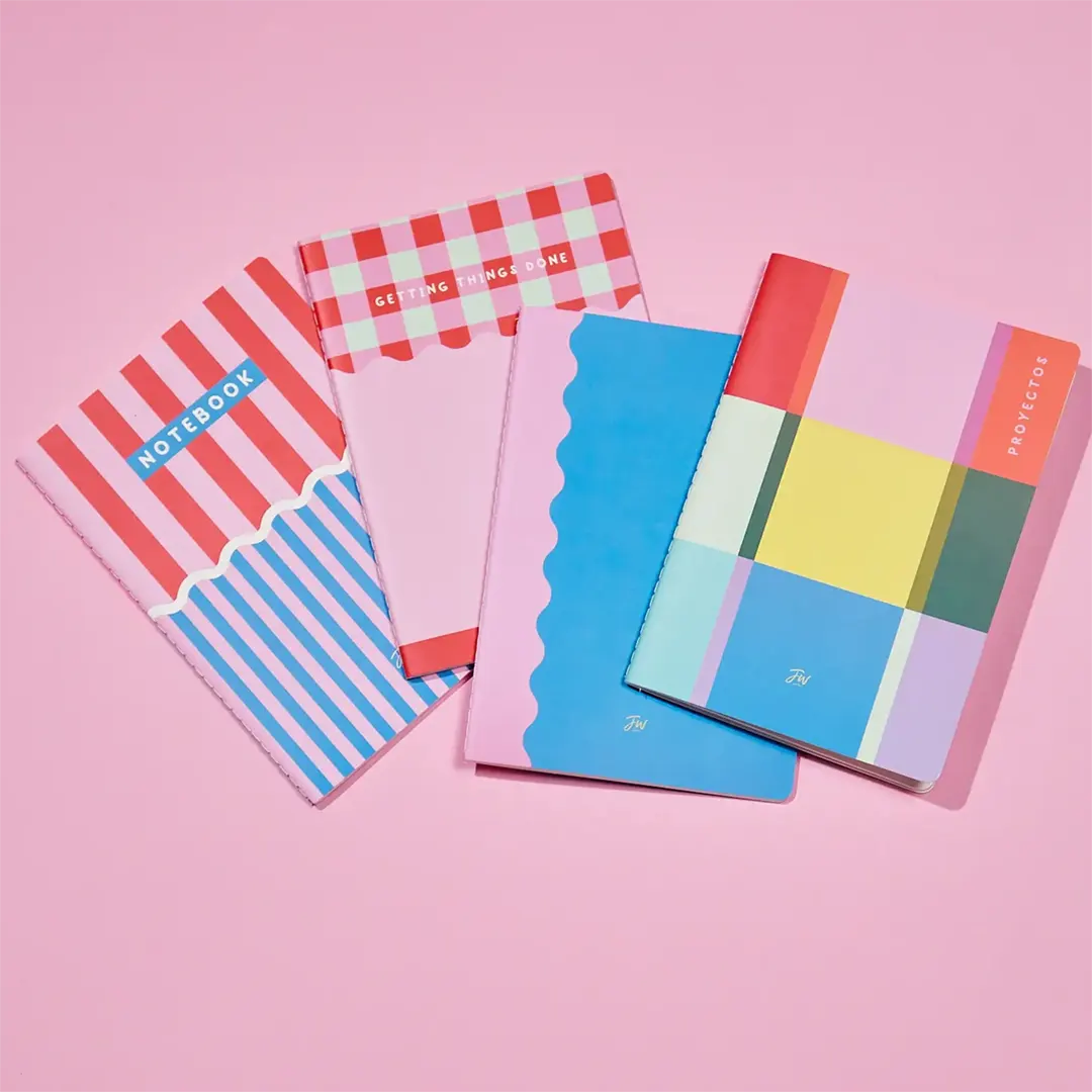 Set de 4 cuadernos con hojas rayadas, cuadriculadas, lisas y bullet. Cada uno tiene 32 hojas de papel de 80 g, en tamaño 148 x 210 mm. Tapa blanda de 250 g con laminado soft touch y lomo cocido, que aporta durabilidad y una terminación prolija.